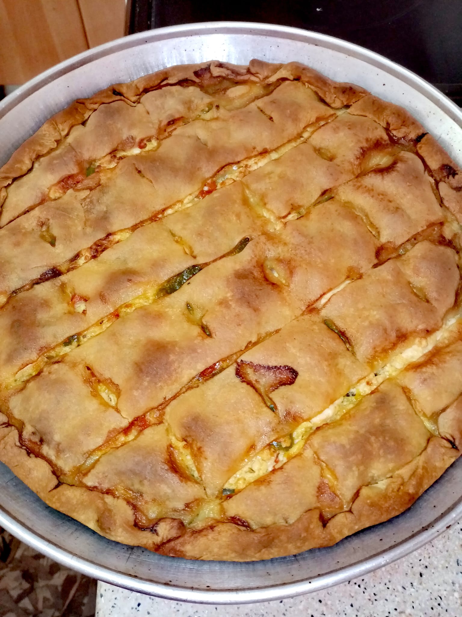 ανοίγω άλλο ένα φύλλο και σκεπάζω την πίτα. Βάζω λίγο λαδάκι από πάνω, χαράζω την πίτα και τη ψήνω σε προθερμασμένο φούρνο στις αντιστάσεις στους 230 βαθμούς. Ψήνω περίπου μία ώρα και ένα τέταρτο, μέχρι να πάρει ωραίο χρώμα.