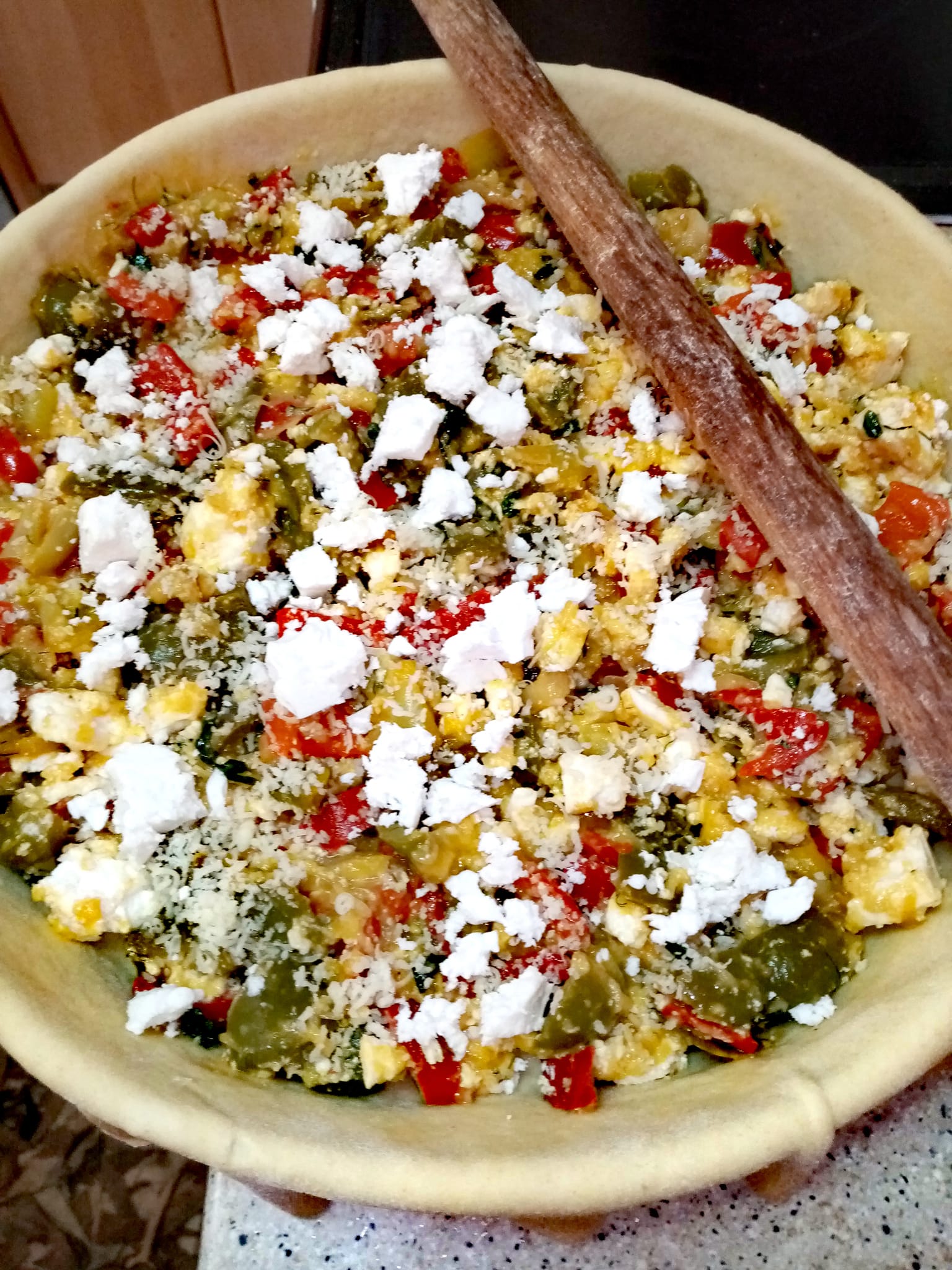 Για τη γέμιση, σε ένα τηγάνι βάζω λάδι να ζεσταθεί. Ρίχνω το κρεμμύδι κομμένο σε φέτες, τα φρέσκα κρεμμυδάκια και το πράσο και τα αφήνω να μαραθούν. Έπειτα, ρίχνω τις πιπεριές όλες κομμένες σε φέτες. Βάζω λίγο αλάτι και πιπέρι και τις αφήνω να μαραθούν και να χάσουν τον όγκο τους. Εγώ τις άφησα περίπου είκοσι λεπτά. Όταν μαραθούν οι πιπεριές, κατεβάζω από τη φωτιά, ρίχνω λίγο μαϊντανό, λίγο άνηθο και αφήνω τη γέμιση να κρυώσει. Όταν κρυώσει, βάζω δύο χτυπημένα αυγά, τη γραβιέρα τριμμένη και τη φέτα, την οποία σπάω με το χέρι μου σε χοντρά κομμάτια.