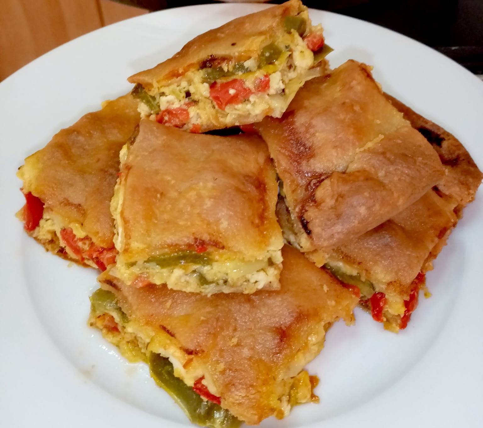 Για τη γέμιση, σε ένα τηγάνι βάζω λάδι να ζεσταθεί. Ρίχνω το κρεμμύδι κομμένο σε φέτες, τα φρέσκα κρεμμυδάκια και το πράσο και τα αφήνω να μαραθούν. Έπειτα, ρίχνω τις πιπεριές όλες κομμένες σε φέτες. Βάζω λίγο αλάτι και πιπέρι και τις αφήνω να μαραθούν και να χάσουν τον όγκο τους. Εγώ τις άφησα περίπου είκοσι λεπτά. Όταν μαραθούν οι πιπεριές, κατεβάζω από τη φωτιά, ρίχνω λίγο μαϊντανό, λίγο άνηθο και αφήνω τη γέμιση να κρυώσει. Όταν κρυώσει, βάζω δύο χτυπημένα αυγά, τη γραβιέρα τριμμένη και τη φέτα, την οποία σπάω με το χέρι μου σε χοντρά κομμάτια.