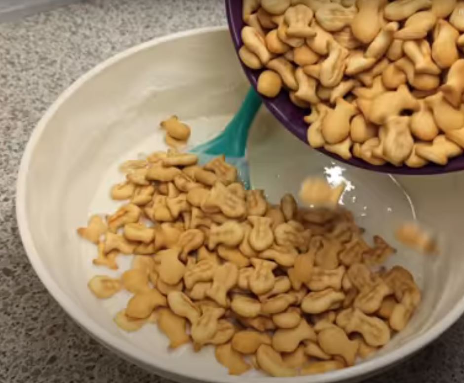 Αδειαζουμε μέσα στο μείγμα τα μπισκοτάκια και ανακατεύουμε.