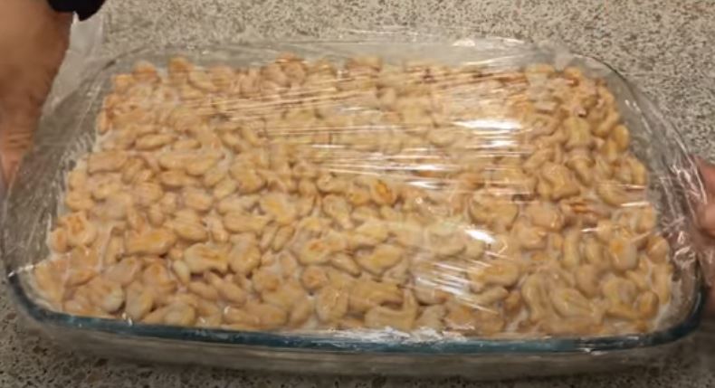 Στρώνουμε ένα πυρέξ με μεμβράνη τροφίμων και αδειάζουμε μέσα το μείγμα και το σκεπάζουμε με μία μεμβράνη και το βάζουμε στο ψυγείο για 40-50 λεπτά.