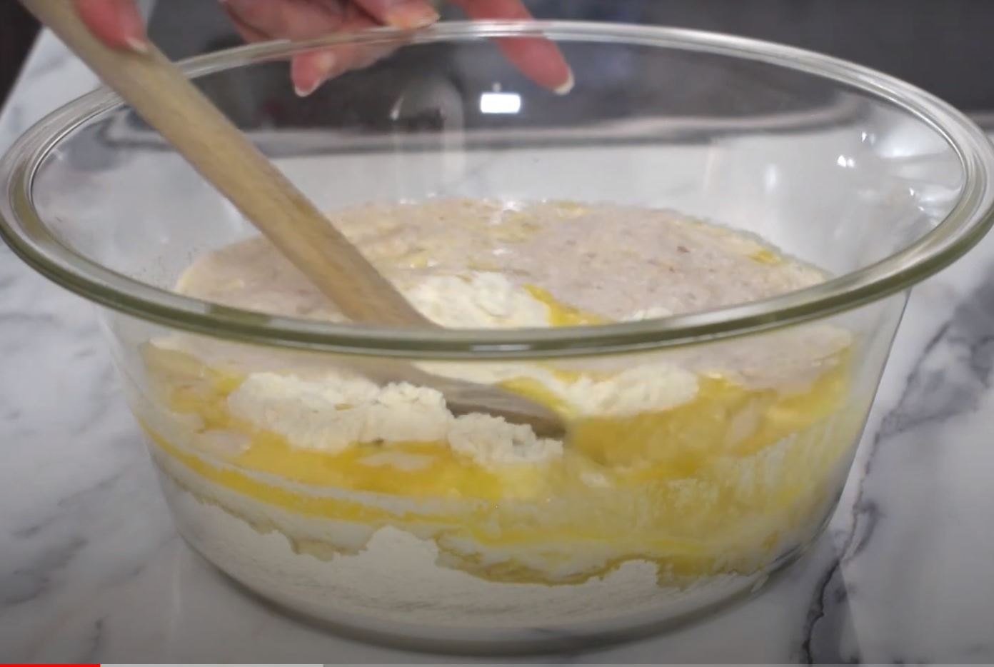 Προσθέστε ζάχαρη, λιωμένο βούτυρο και μείγμα μαγιάς.