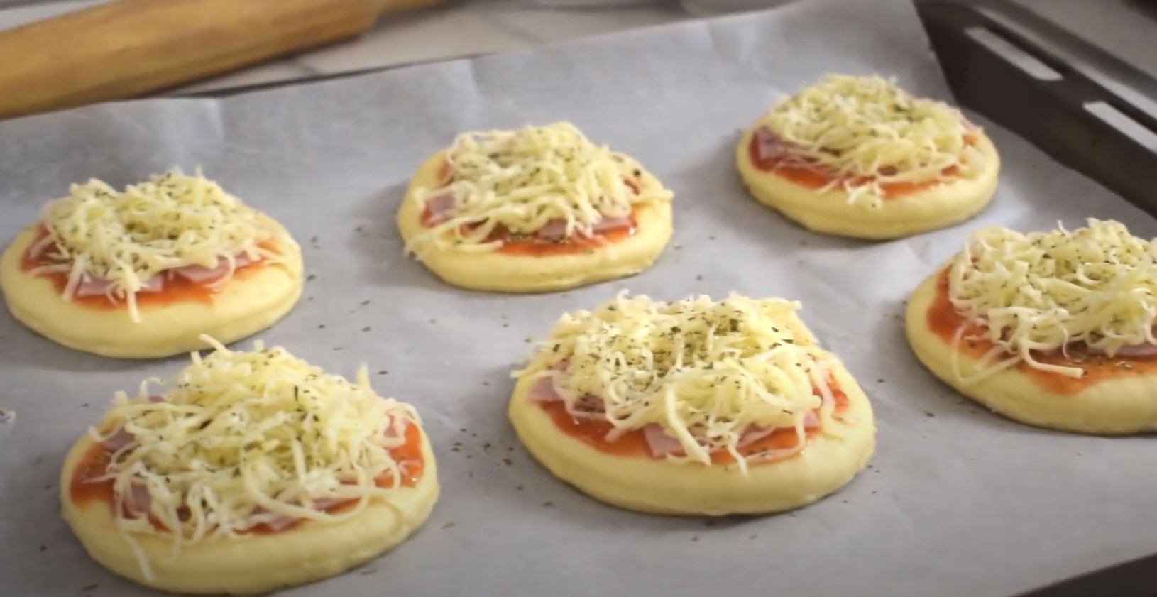 Βάλτε κέτσαπ, ρίγανη, ζαμπόν και γκούντα ή κάποια άλλη γέμιση της επιλογής σας σε μικρές πίτσες.