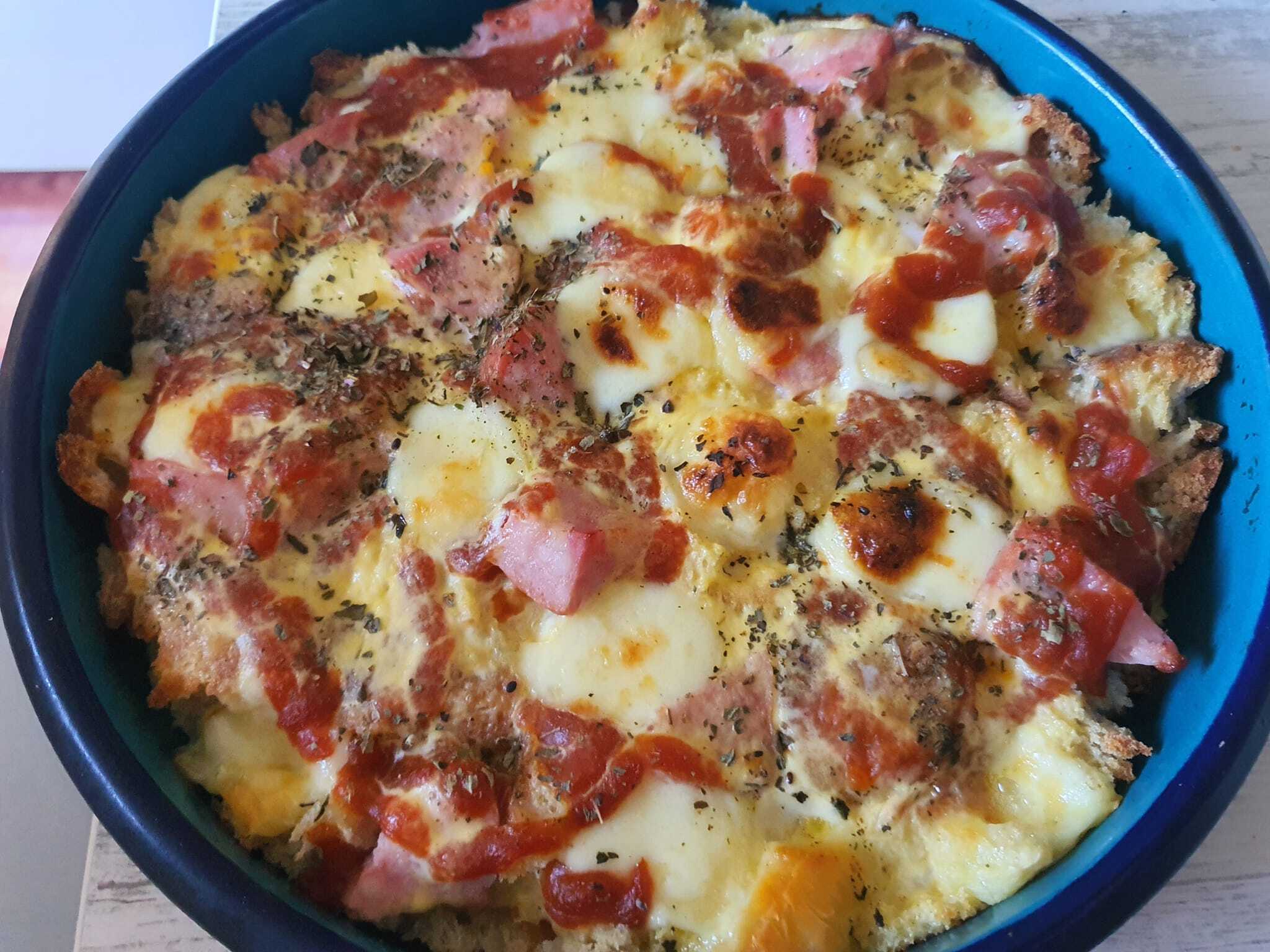 Συμπληρώστε την πίτσα με δύο χτυπημένα αυγά με δύο ή τρεις κουταλιές γιαούρτι με μια πρέζα σόδα, ​​γάλα και αλάτι.