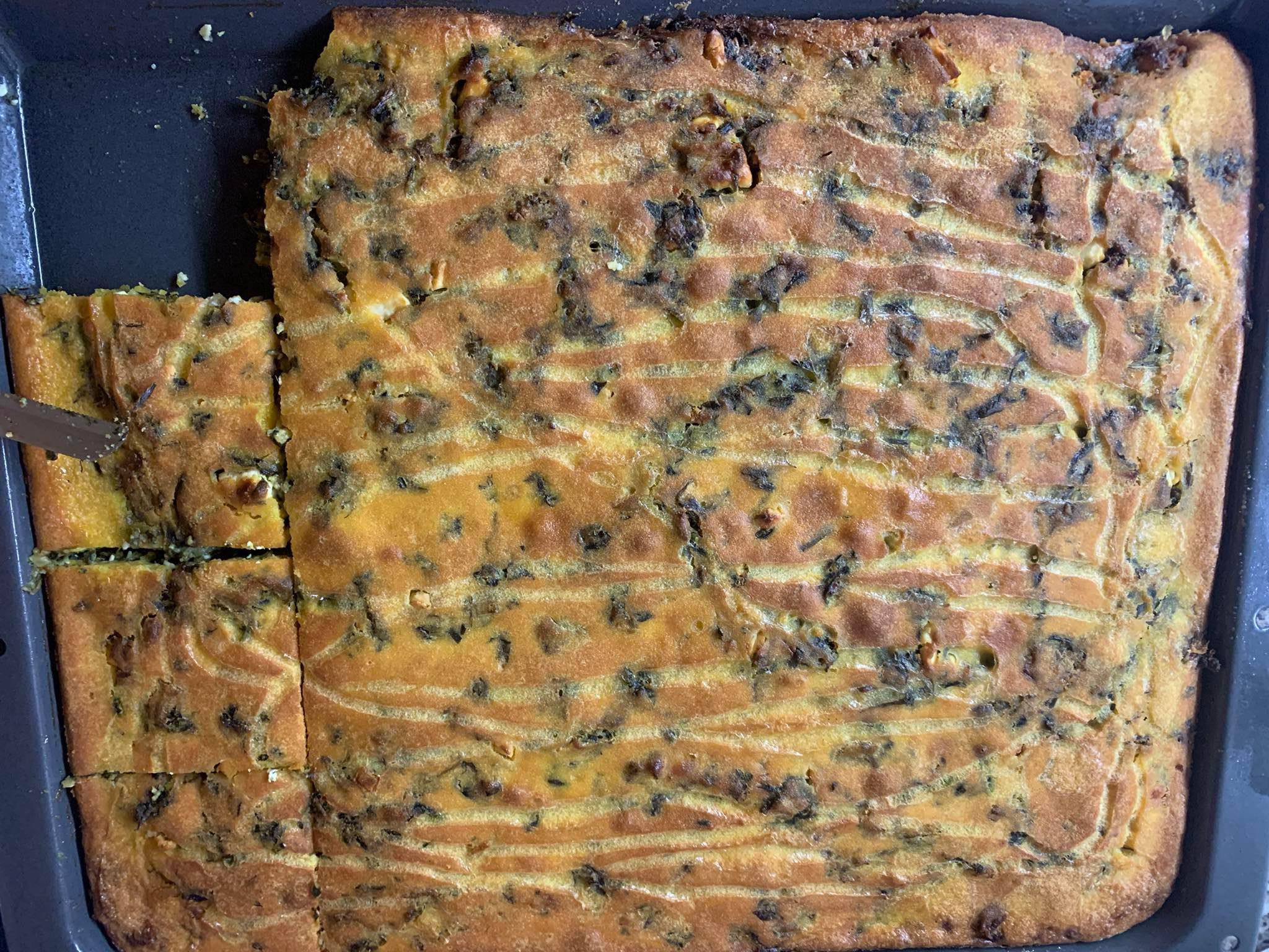 Ρίχνετε από πάνω το μείγμα με τα χόρτα που ετοιμάσατε, στρώνετε το μείγμα καλά,