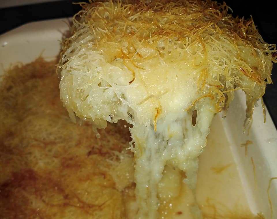 Όπως βγάζουμε καυτό το κανταΐφι κιουνεφέ από το φούρνο, το περιχύνουμε με το καυτό σιρόπι, σιγά σιγά.