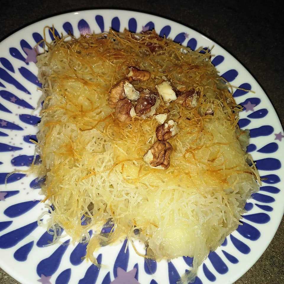 Ξεκινάω να αφρατέξω το κανταιφι να μην έχει κομπους και το χωρίζω σε δύο μέρη. Βουτυρώνουμε το ταψί 28 εκ ριχνουμε το μισό κανταίφι και από
