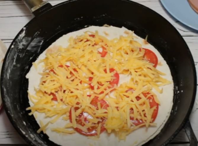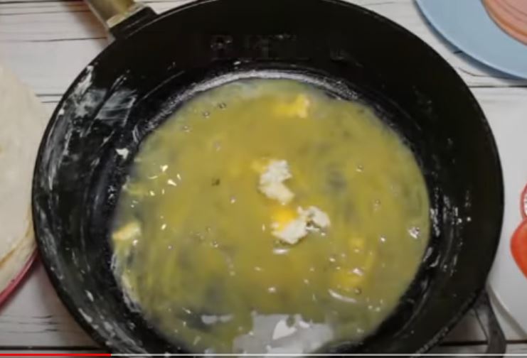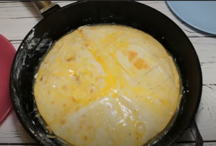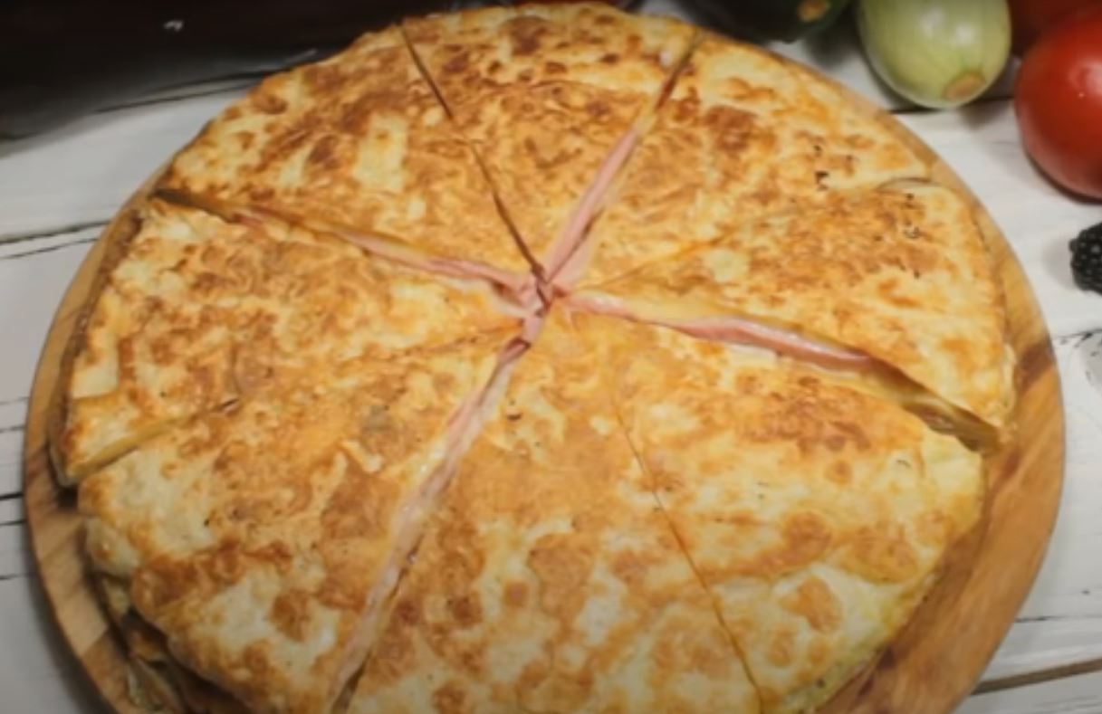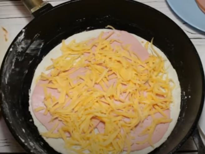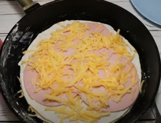 Αλατίζουμε τα αυγά και προσθέτουμε πιπέρι, και ανακατεύουμε. Ρίχνουμε τα μισά αυγά στο τηγάνι. Τοποθετήστε την πρώτη πίτα, ζαμπόν και τριμμένο τυρί,