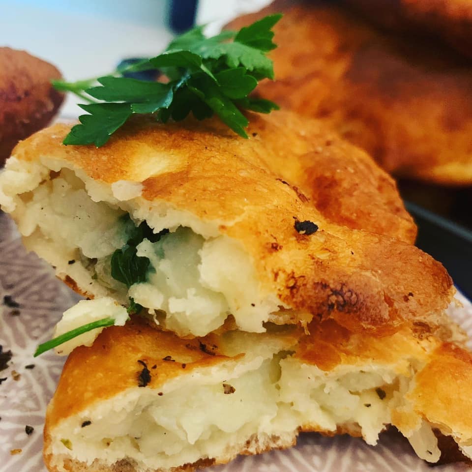 Στη συνέχεια, συμπληρώστε κάθε ζύμη με γέμιση πατάτας ή γέμιση φέτας.