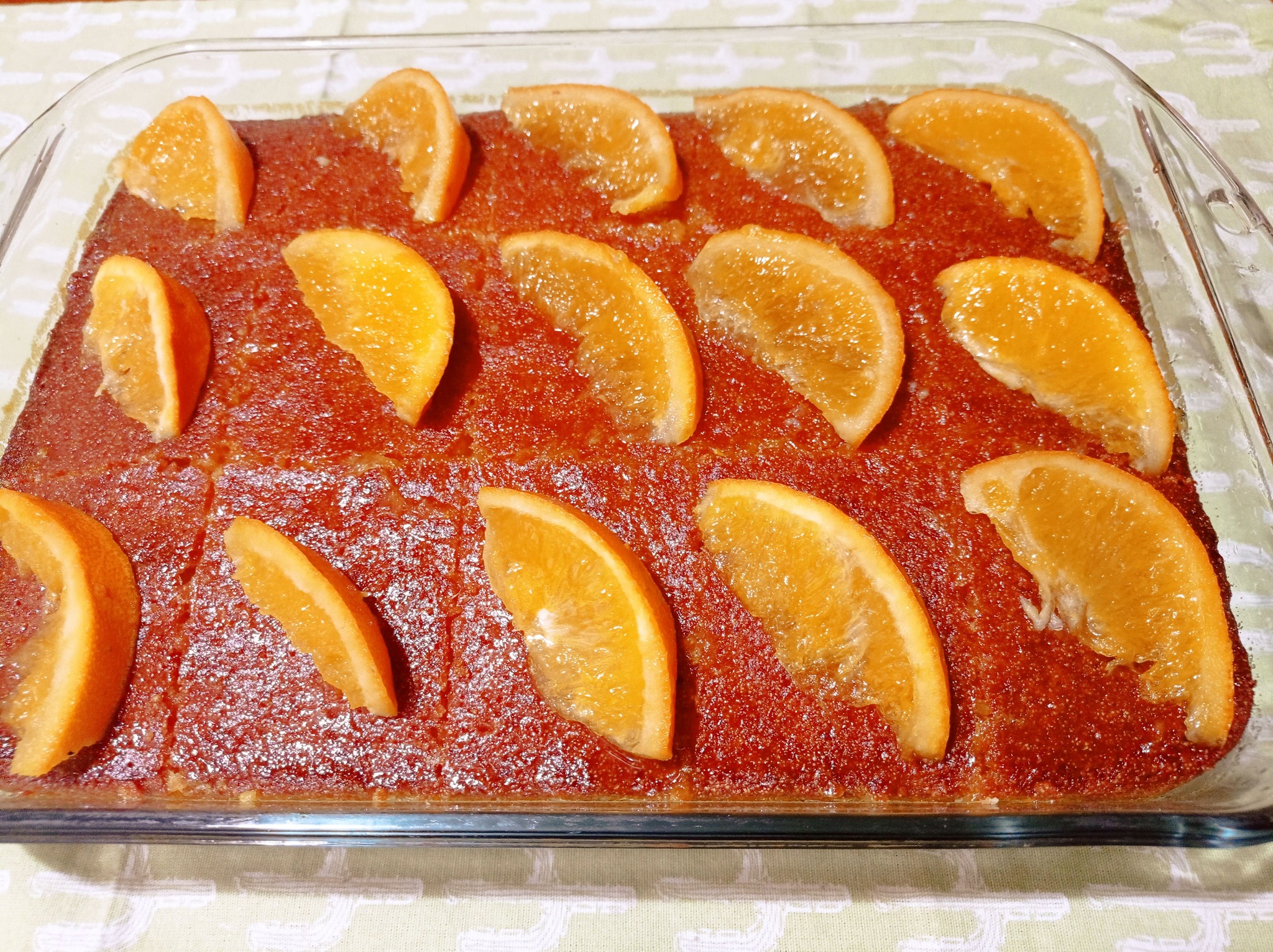 Χτυπάμε τη ζάχαρη με τα αυγά, προσθέτουμε το λάδι,το γιαούρτι, το ξύσμα και τέλος το σιμιγδάλι με το αλεύρι.Αδειάζουμε το μίγμα σε βουτυρωμένο πυρέξ και ψήνουμε στους 180 για 45 λεπτά.Στο μεταξύ ετοιμάζουμε το σιρόπι βράζοντας όλα τα υλικά για 5 λεπτά.Μολις βγάλουμε το ραβανί από το φούρνο,το κόβουμε σε κομμάτια και περιχύνουμε το σιρόπι, στολίζουμε με τις φέτες πορτοκαλιού κι αφήνουμε να πιει όλο το σιρόπι.