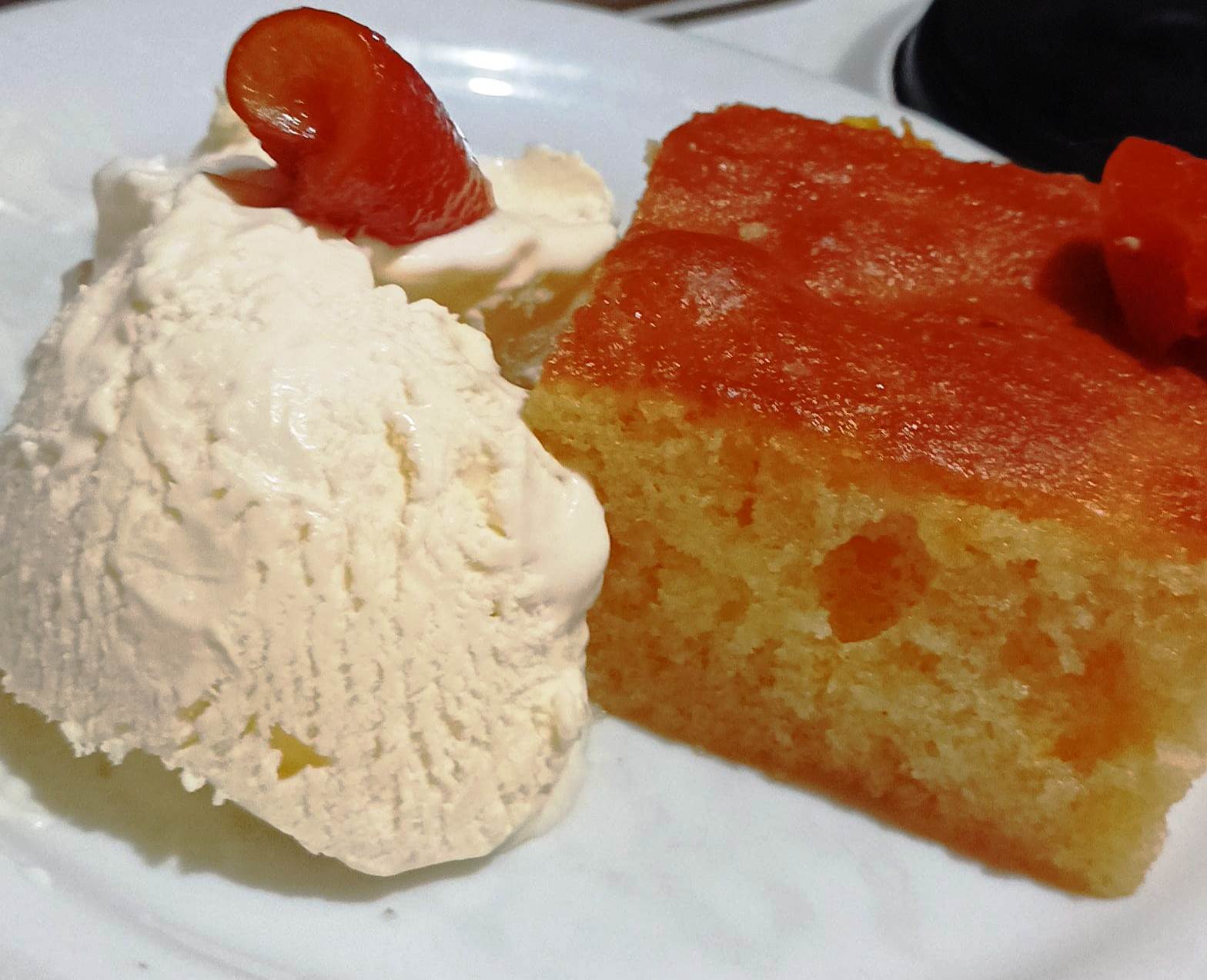 Σερβίρουμε την πορτοκαλόπιτα κομμένη σε κομμάτια, με μια γενναία μπάλα παγωτό πορτοκάλι.