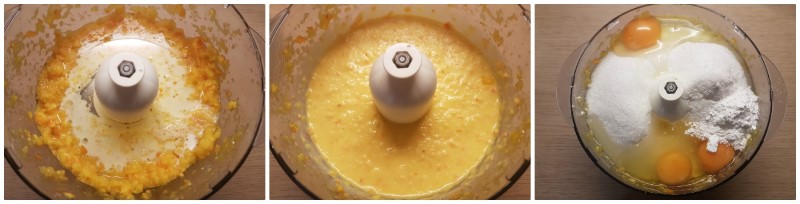 Τοποθετήστε τα ψιλοκομμένα πορτοκάλια στο μπλέντερ. Δώστε ένα πρώτο χτυπημα. Προσθέτουμε το λάδι και το γάλα και ανακατεύουμε ξανά.