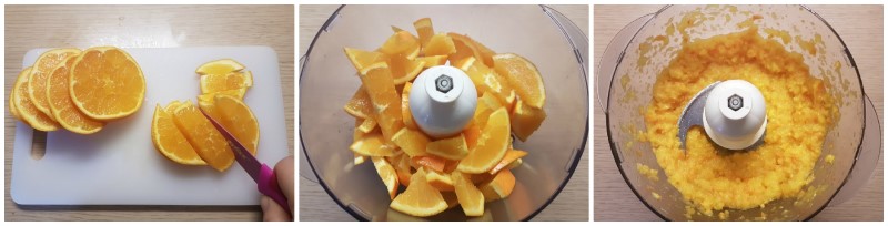 Παίρνετε τα πορτοκάλια, τα πλένετε καλά με τρεχούμενο νερό, τα στεγνώνετε και τα κόβετε σε φέτες και μετά σε μεγάλα κομμάτια, αφαιρώντας τυχόν χαλασμενα μέρη και σπόρους. Ζυγίστε 350 γρ. Κόβουμε και ανακατεύουμε τα πορτοκάλια.