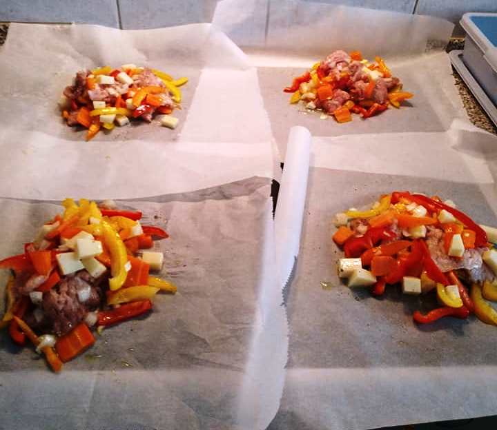 Κόβουμε όλα τα λαχανικά και σε 4 λαδοκολλες βάζουμε λίγο από όλα τα υλικά μας εγώ τα έβαλα σε ένα μπολάκι πρόσθεσα το ελαιόλαδο τα ανακάτεψα και μετά τα έβαζα όπως τα βλέπετε στις φωτογραφίες.