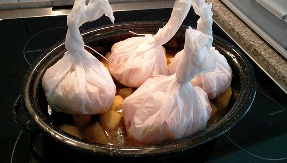 Στην συνέχεια τα έκανα πουγκια κ τα έδεσα με σπάγκο έκοψα τις πατάτες τις έβαλα και αυτές αλάτι πιπέρι ρίγανη ελαιόλαδο μείγμα για πατάτες φούρνου και λεμόνι