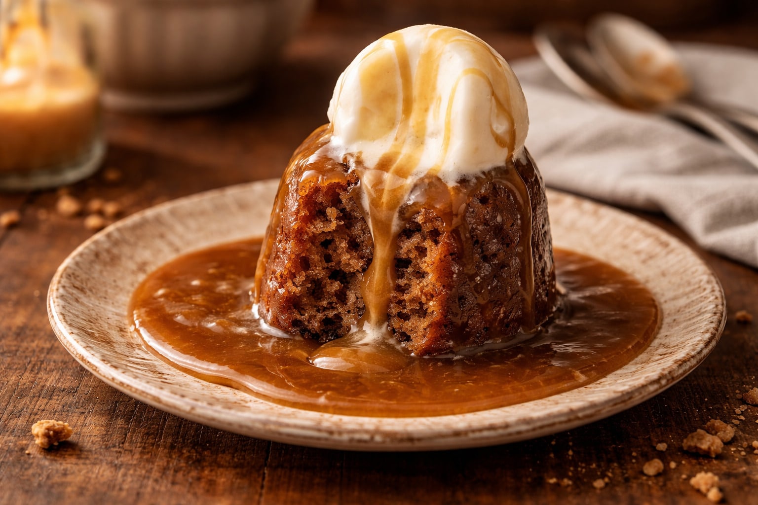 Το γεγονός ότι περιχύνετε το κέικ όσο είναι ακόμα ζεστό με τη σάλτσα εξασφαλίζει ότι η πουτίγκα θα “τραβήξει” τη γεύση μέχρι τον πυρήνα του, δημιουργώντας αυτή την περιβόητη κολλώδη υφή. Αυτό το στοιχείο συνδυάζεται άψογα με τη χρήση βουτύρου υψηλής ποιότητας, οδηγώντας σας με σιγουριά σε μια σάλτσα που δεν διαχωρίζεται και παραμένει λαμπερή και ομοιογενής