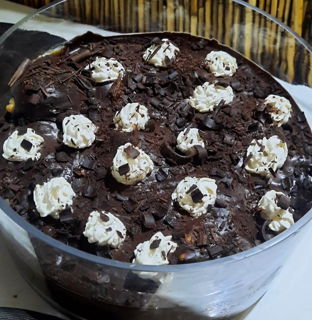 Σε ατομικα μπολάκια ρίχνουμε δύο κουταλιές της σούπας λευκή κρέμα, λίγα μπισκότα τριμμενα και από πάνω κρέμα σοκολάτας.