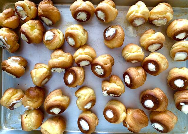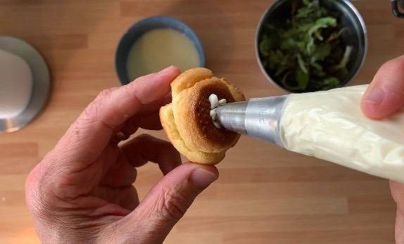 Κάνω μια τρυπούλα σε κάθε σού από κάτω και με ένα κορνέ γεμίζω με την κρέμα.