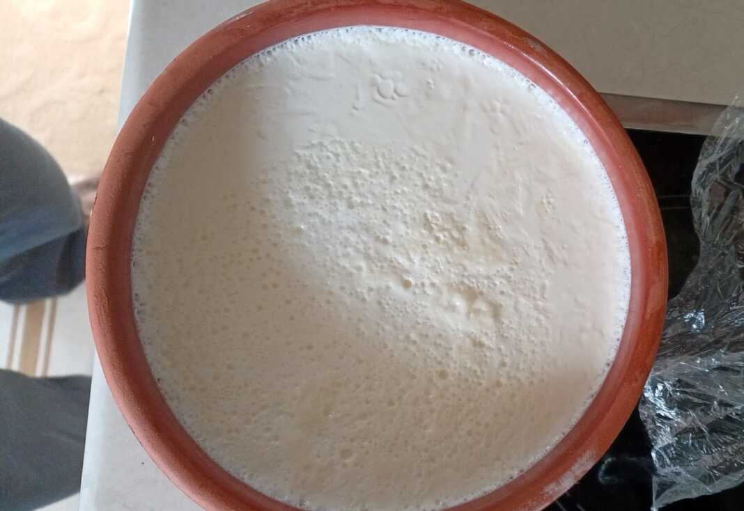 Μετά από αυτό ρίχνουμε το γάλα μας στα σκεύη του γιαουρτιού από ψηλά ώστε να δημιουργηθεί ένας αφρός και να γίνει αργότερα μια όμορφη πέτσα.