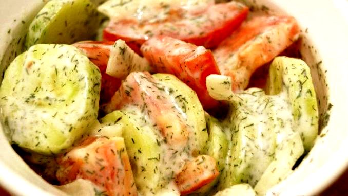 4. Προσθέστε κρεμμύδι, αγγούρι και ντομάτα στο μείγμα και ανακατέψτε μέχρι να γεμίσουν τα λαχανικά με το σάλτσα.