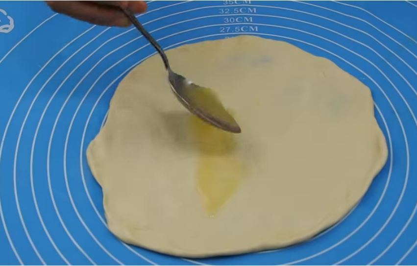 Παίρνουμε μια μια μπάλα ρίχνουμε λίγο βούτυρο στο πάγκο και την ανοίγουμε με τα χέρια την βουτυρώνουμε