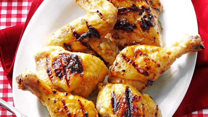 Μόλις η σχάρα είναι έτοιμη, τοποθετήστε το κοτόπουλο απευθείας επάνω στις σχάρες και ψήστε,  για περίπου 20 λεπτά. Γυρίστε το κοτόπουλο και βουρτσίστε κάθε κομμάτι με την υπόλοιπη μαρινάδα. Συνεχίστε να ψέστε, για άλλα 20 έως 30 λεπτά, έως ότου να δείτε με ένα πηρούνι ότι έχει ψηθεί καλά μέσα το μπούτι .