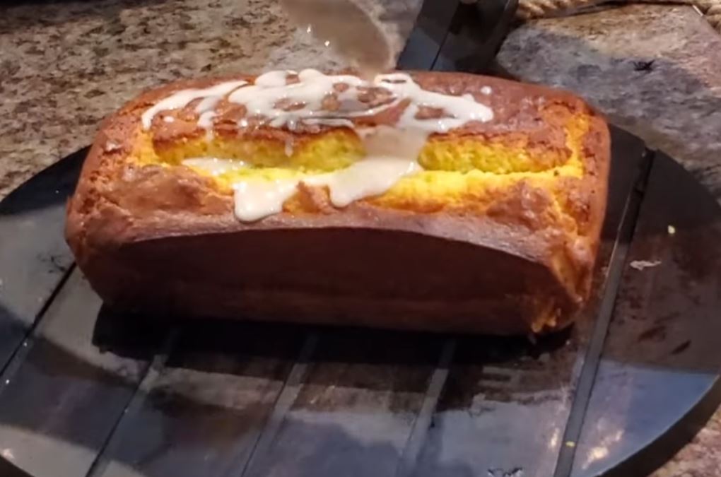 Σε ένα μπολάκι στύβουμε το λεμόνι και ανακατεύουμε με ζάχαρη άχνη για να κάνουμε ένα γλάσο με το οποίο απλώνουμε επάνω στο κέικ μας