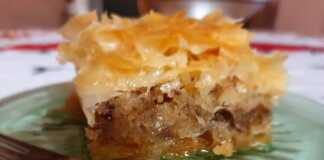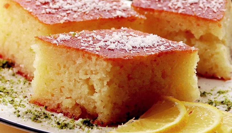 Ψήνουμε σε προθερμασμένο φούρνο 175 βαθμών για 40-45 λεπτά. Βράστε την ζάχαρη και το νερό για το σιρόπι. Βγάζετε τη κατσαρολα από τη φωτιά 3-4 λεπτά αφού βράσει. Ρίχνουμε το ζεστό σιρόπι πάνω από το ζεστό γλυκό. Πασπαλίζουμε με καρύδα και φιστίκια σε σκόνη και σερβίρουμε.