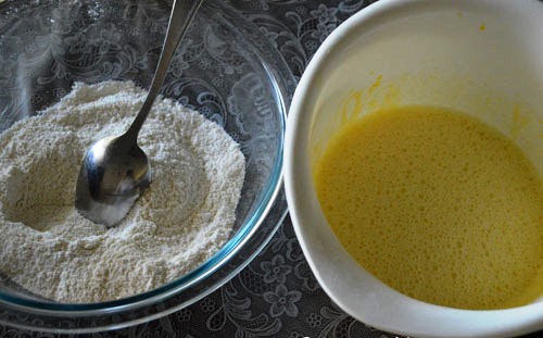 Ανακατεύουμε το σιμιγδάλι και το αλεύρι σε ένα βαθύ πιάτο μετά χτυπάμε τα αυγά και προσθέτουμε τη βανίλια και τη ζάχαρη και στη συνέχεια ανακατεύουμε καλά.