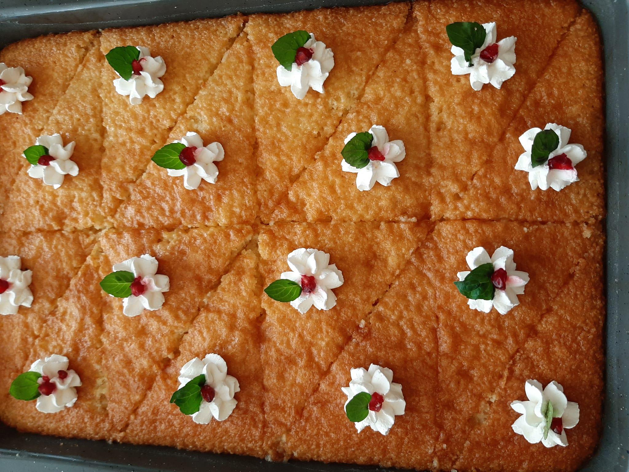 Χτυπάμε τα αυγά με τη ζάχαρη προσθέτουμε τα υπόλοιπα υλικά. Αδειάζουμε το μείγμα σε λαδωμένο και αλευρωμένο ταψί. Το βάζετε στο προθερμασμένο φούρνο για 45 λ περίπου.