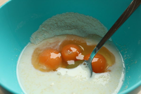 Προσθέστε βανίλια, γάλα και αυγά. Ανακατέψτε καλά.