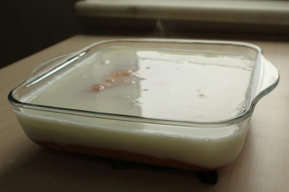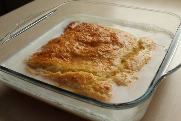 Ρίξτε το ζεστό σιρόπι γάλακτος πάνω από κέικ. (Μην φοβηθείτε εάν καλύπτει πλήρως το κέικ, θα βυθιστεί σιγά-σιγά το κέικ καθώς τον αφήνετε να ξεκουραστεί.) Αφού ξεκουραστεί περίπου 20-30 λεπτά στον πάγκο, βάλτε στο ψυγείο μέχρι να κρυώσει.