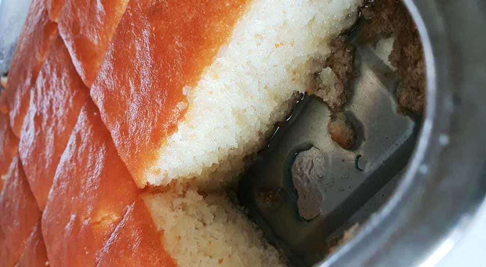 Μόλις βγάλουμε το ζεστό κέικ από τον φούρνο, με μία κουτάλα σιροπιάζουμε αμέσως με το κρύο σιρόπι.