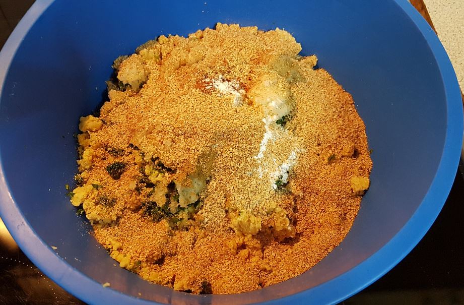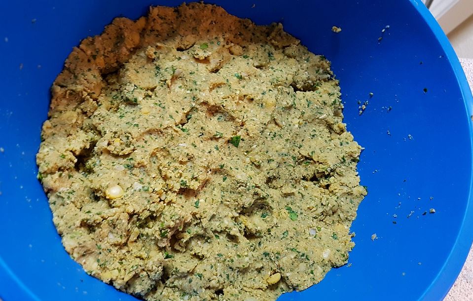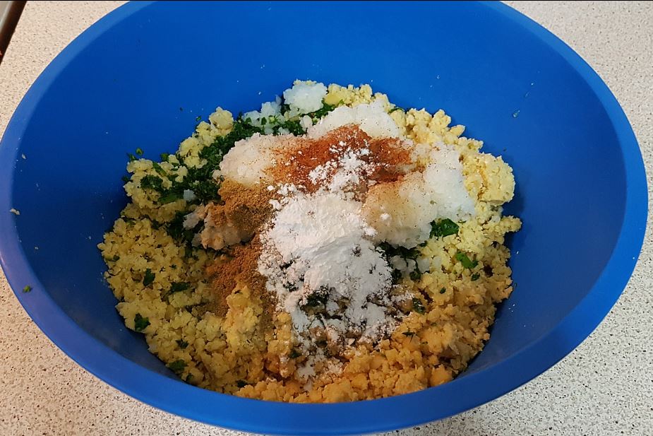 Θρυμματίζουμε τα κρεμμύδια, το σκόρδο, τον μαϊντανό και μαζί με τα μπαχαρικά (αλάτι, κόκκινο πιπέρι γλυκό, κύμινο, κόλιανδρος ξερός) τα βάζουμε στο λεκανάκι με τα ρεβύθια.