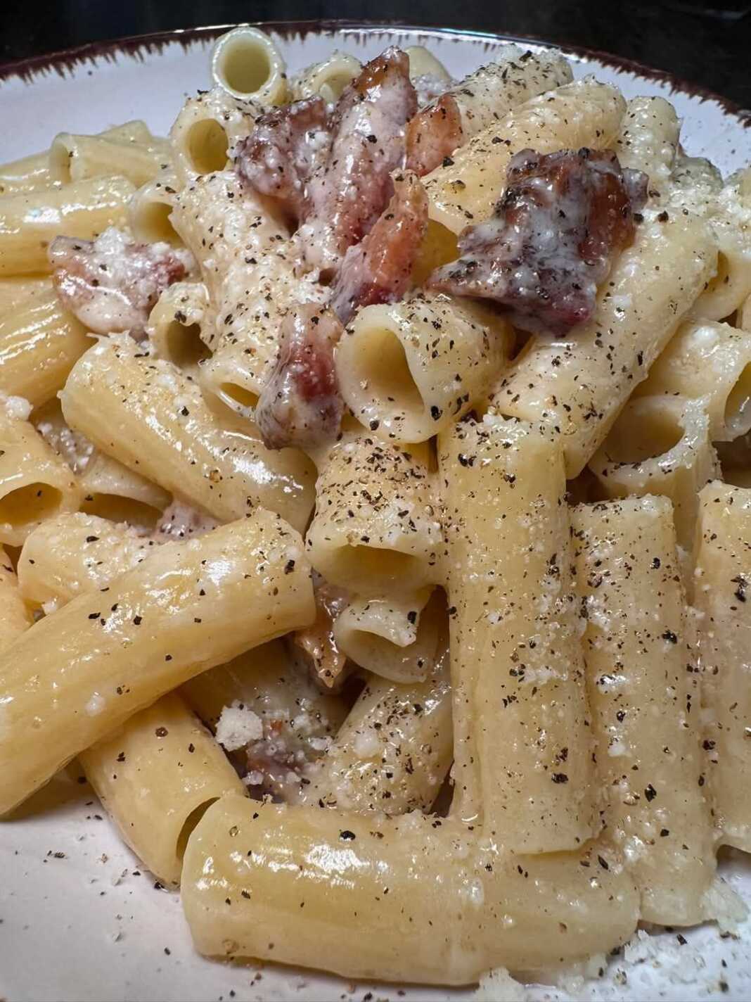 Ανακατεύουμε το νερό με το λίπος. Το νερό μαγειρέματος, το οποίο είναι γεμάτο άμυλο, θα κάνει τα ριγκατονι πιο κρεμώδη.