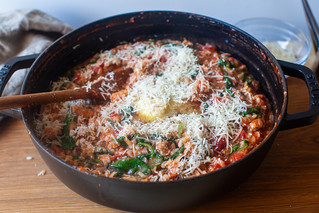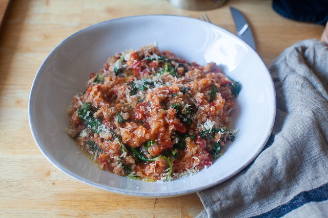 Σερβίρετε αμέσως (το ριζότο θα πήξει καθώς κρυώνει) και πασπαλίζετε με πρόσθετη παρμεζάνα, αν θέλετε.
