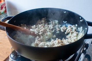 Μαγειρέστε, και σπάστε το λουκάνικο με ένα κουτάλι, μέχρι το λουκάνικο να τσιγαριστεί και το κρεμμύδι έχει μαλακώσει, 3 έως 5 λεπτά.