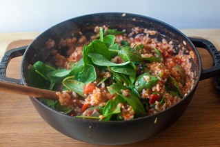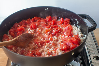 Προσθέστε περίπου 2 φλιτζάνια από το ζεστό μίγμα ντομάτας με ρύζι. Σιγοβράζουμε σε μεσαία χαμηλή φωτιά, ανακατεύοντας περιστασιακά, μέχρι να απορροφηθεί, 4 έως 5 λεπτά.