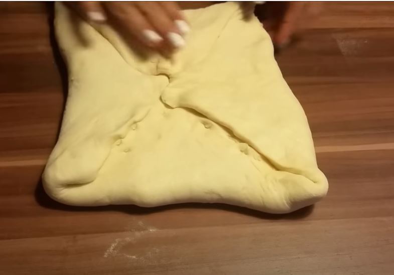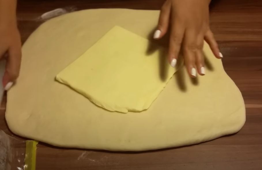 Τοποθετούμε στο κέντρο το παγωμένο βούτυρο και κλείνουμε την ζυμη όπως βλεπετε στην φωτό πολυ καλα και κολλάμε τις χαραμάδες να κλείσουν.