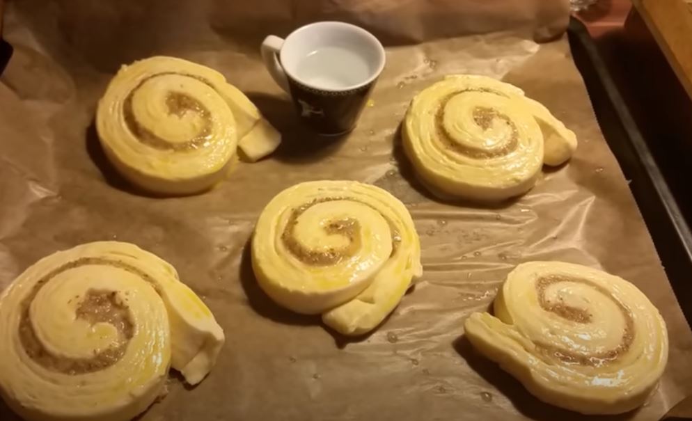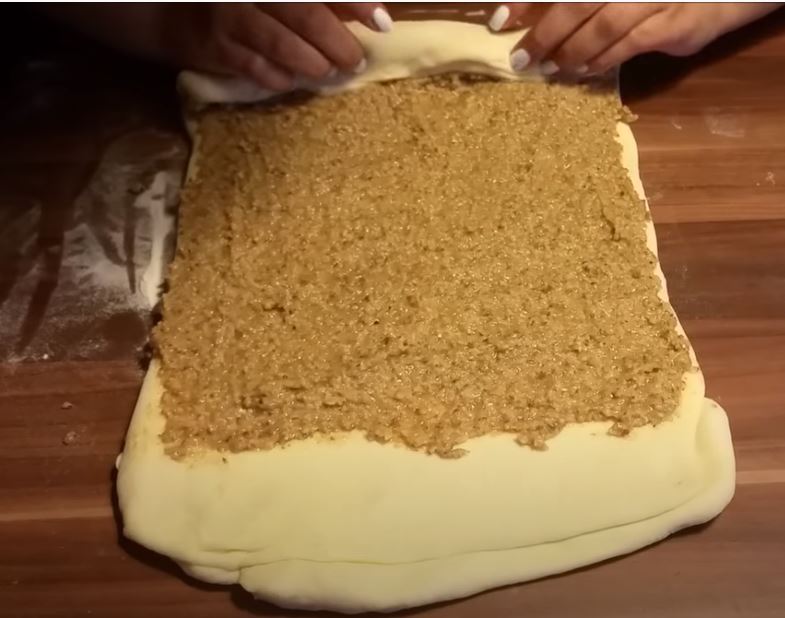 Τυλίγουμε την ζύμη με την γέμιση σε ρολό και και την κόβουμε σε ροδέλες.