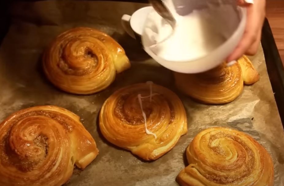 Βγάζουμε από το φούρνο τα ρολάκια και τα αλείφουμε με την μαρμελάδα