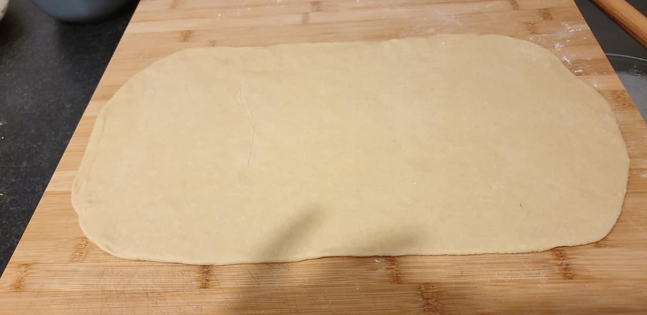 1) – Ανακατέψτε καλά όλα τα συστατικά και σχηματίστε μια μαλακή ζύμη. Αφήστε την τυλιγμένη σε ζεστό μέρος έως ότου η ζύμη διπλασιαστεί σε μέγεθος για περίπου 30 λεπτά. Στη συνέχεια ξεδιπλώστε τη ζύμη σε μια ελαφρώς αλευρωμένη επιφάνεια. Ανοίξτε ένα ορθογώνιο φύλλο έως 1cm πάχος περίπου. Λιπανετε με λίγο βούτυρο.