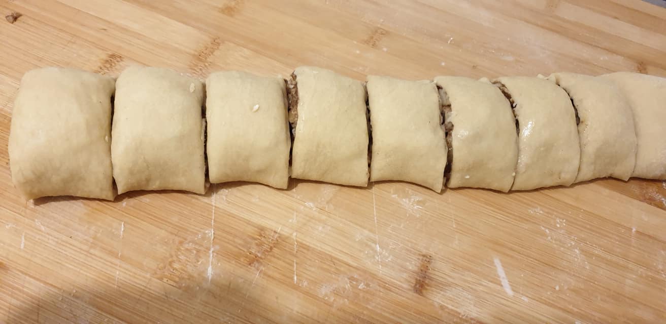 3) – Στη συνέχεια αρχίστε να το τυλίγετε κατά μήκος για να σχηματίσετε ένα ρολό. Βρέξτε την πλευρά με τα δάχτυλά σας στο τέλος έτσι ώστε να κολλήσει καλά στο κλεισιμο. Κόψτε σε ίσα μέρη περίπου. 5 cm το καθένα.