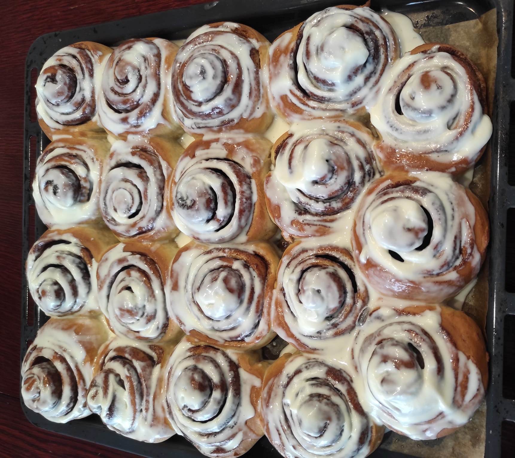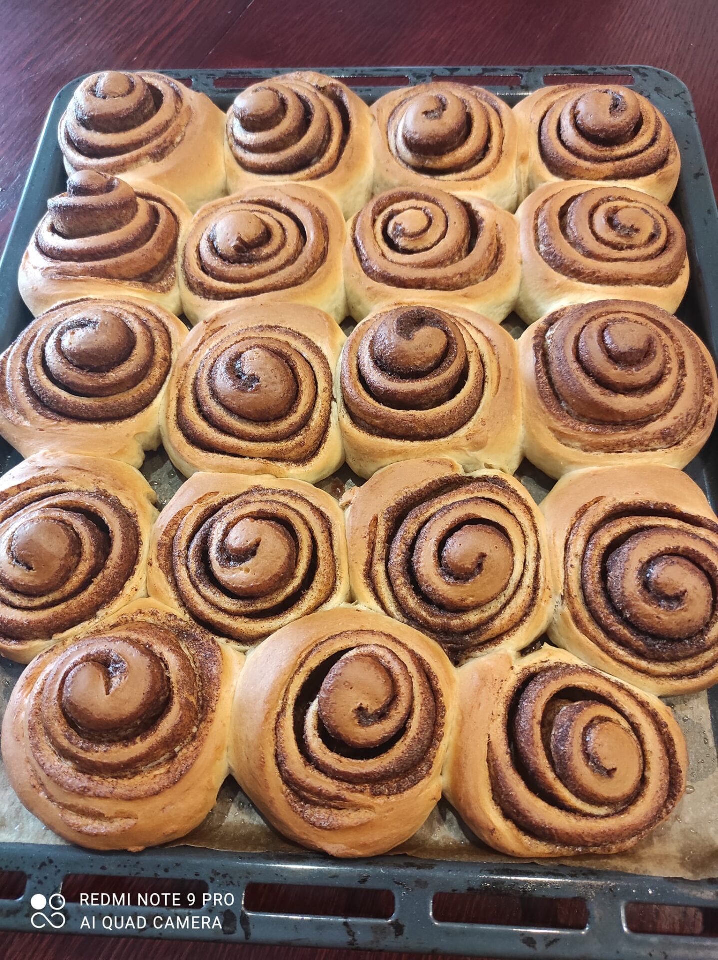 5) Διπλώστε την άκρη της ζύμης απο κάθε ρολακι κανέλα κάτω από τον πάτο και βάλτε τα ψωμάκια σε χαρτι ψησιματος, σκεπάστε με μια πετσέτα και αφήστε σε ζεστό μέρος για άλλα 30-50 λεπτά να φουσκώσει