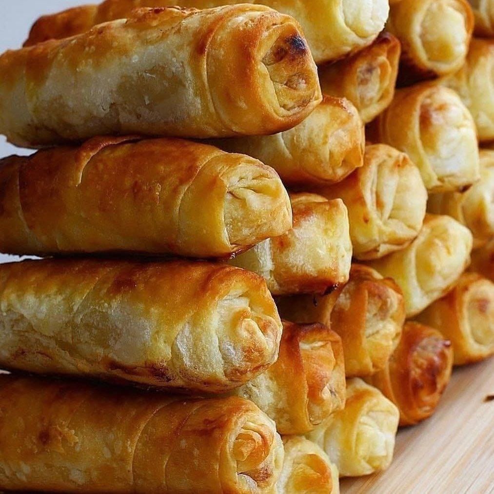 Για κάθε τετράγωνο, απλώνω 1 κουταλιά της σούπας γέμιση και το τυλίγω σε σχήμα φλογέρας.