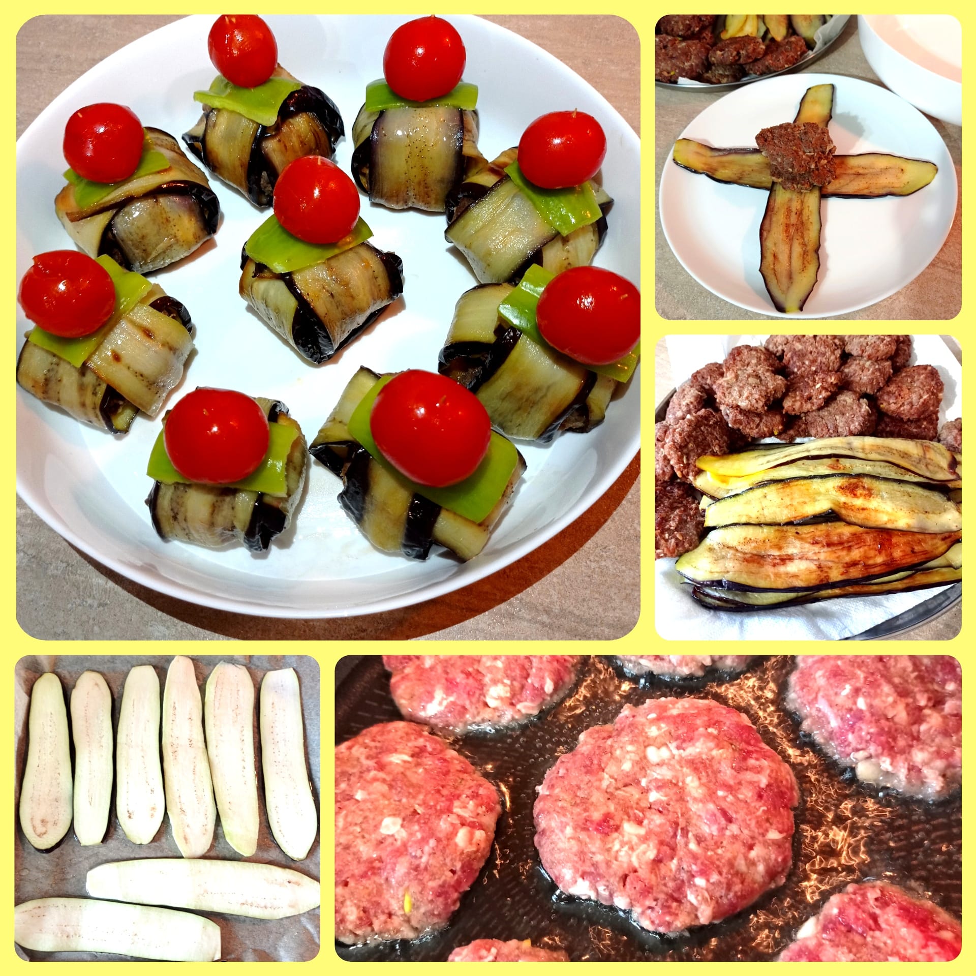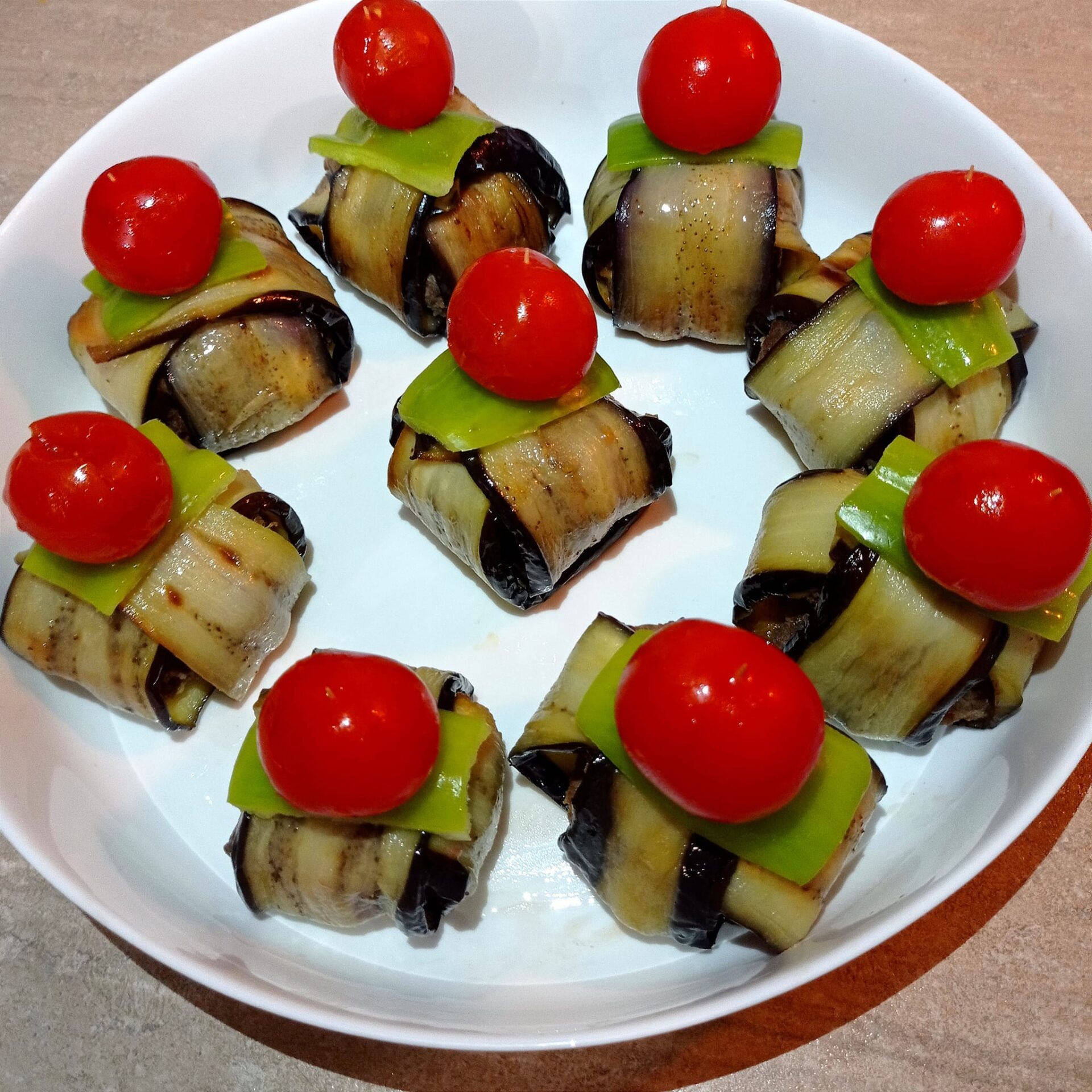 Παίρνουμε 2 λωρίδες μελιτζάνας και τις τοποθετούμε σταυρωτά, τοποθετούμε τον κεφτέ στη μέση (ίσως 2 κεφτεδάκια – το ένα πάνω στο άλλο, όπως κάνω εγώ) και κλείνουμε τις λωρίδες. Με μια οδοντογλυφίδα πιάνουμε τις άκρες από πάνω για να μην ανοίξει και βάζουμε ένα κομμάτι πράσινη πιπεριά και ντοματίνι (μπορείτε και να τα τυλίγετε σαν κορδόνια).
