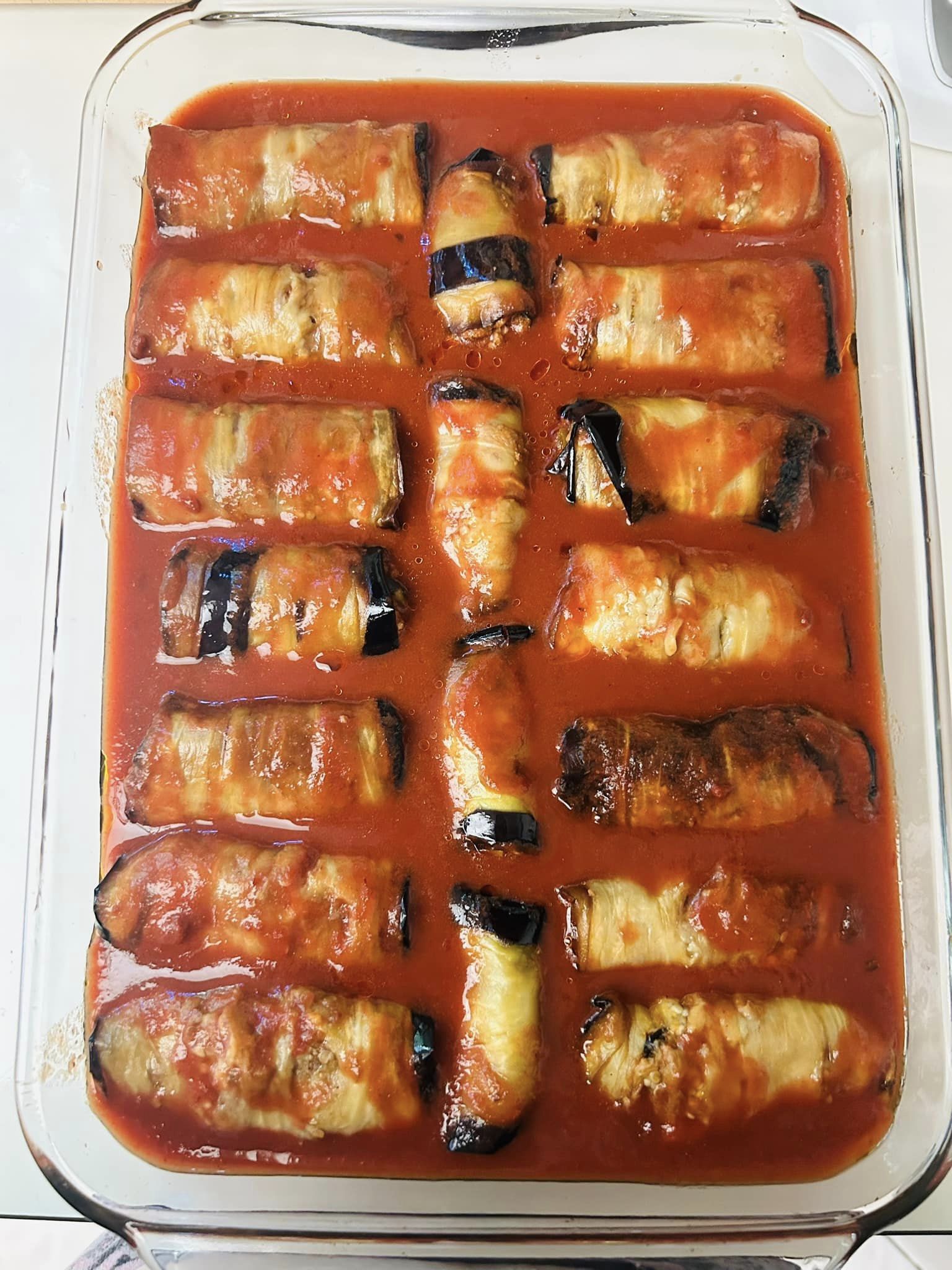 τυλίξτε το σε ρολό και τοποθετήστε το σε ένα ταψί 22 x 30 εκ. Συνεχίστε αυτή τη διαδικασία μέχρι να εξαντλήσετε τις μελιτζάνες σας.