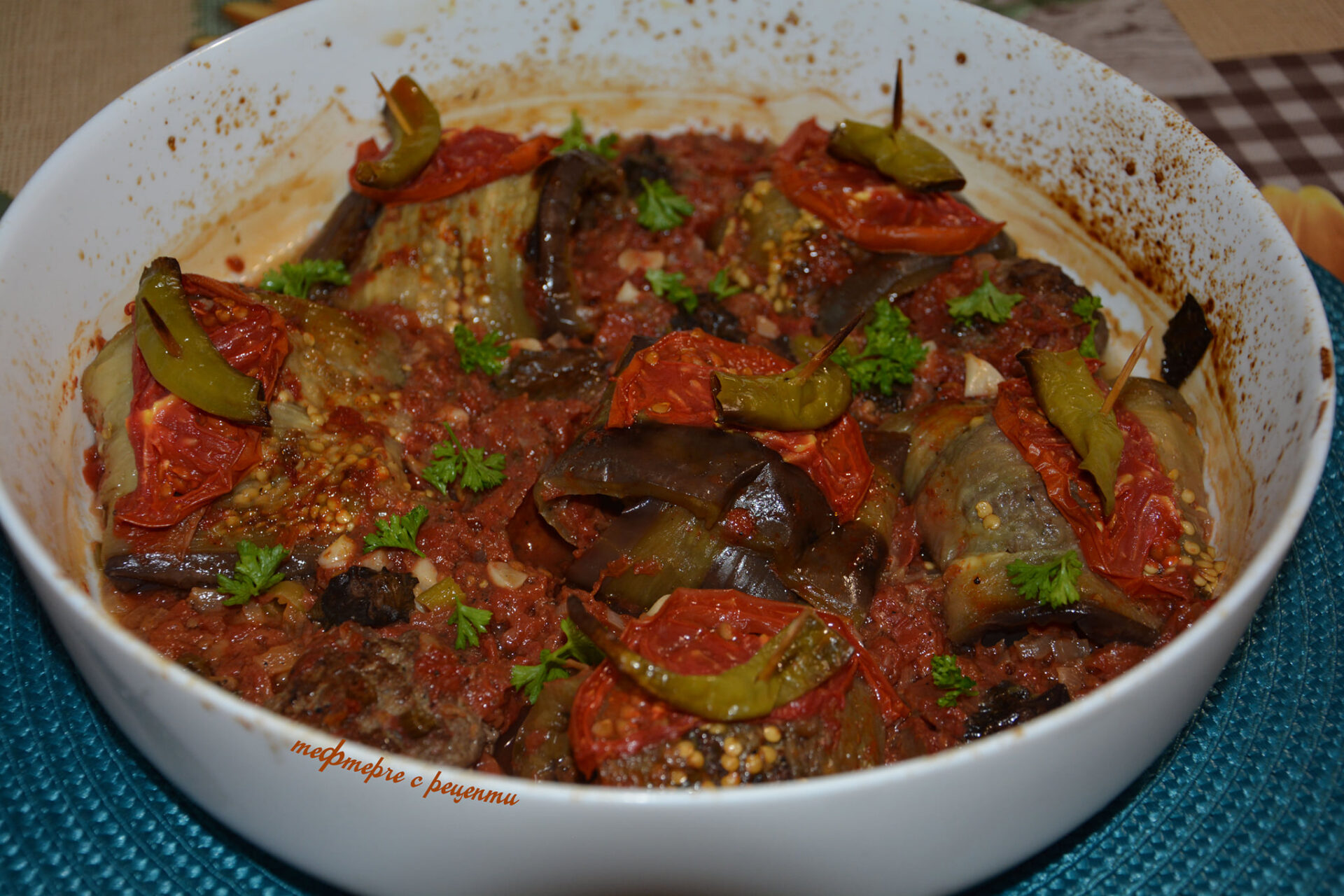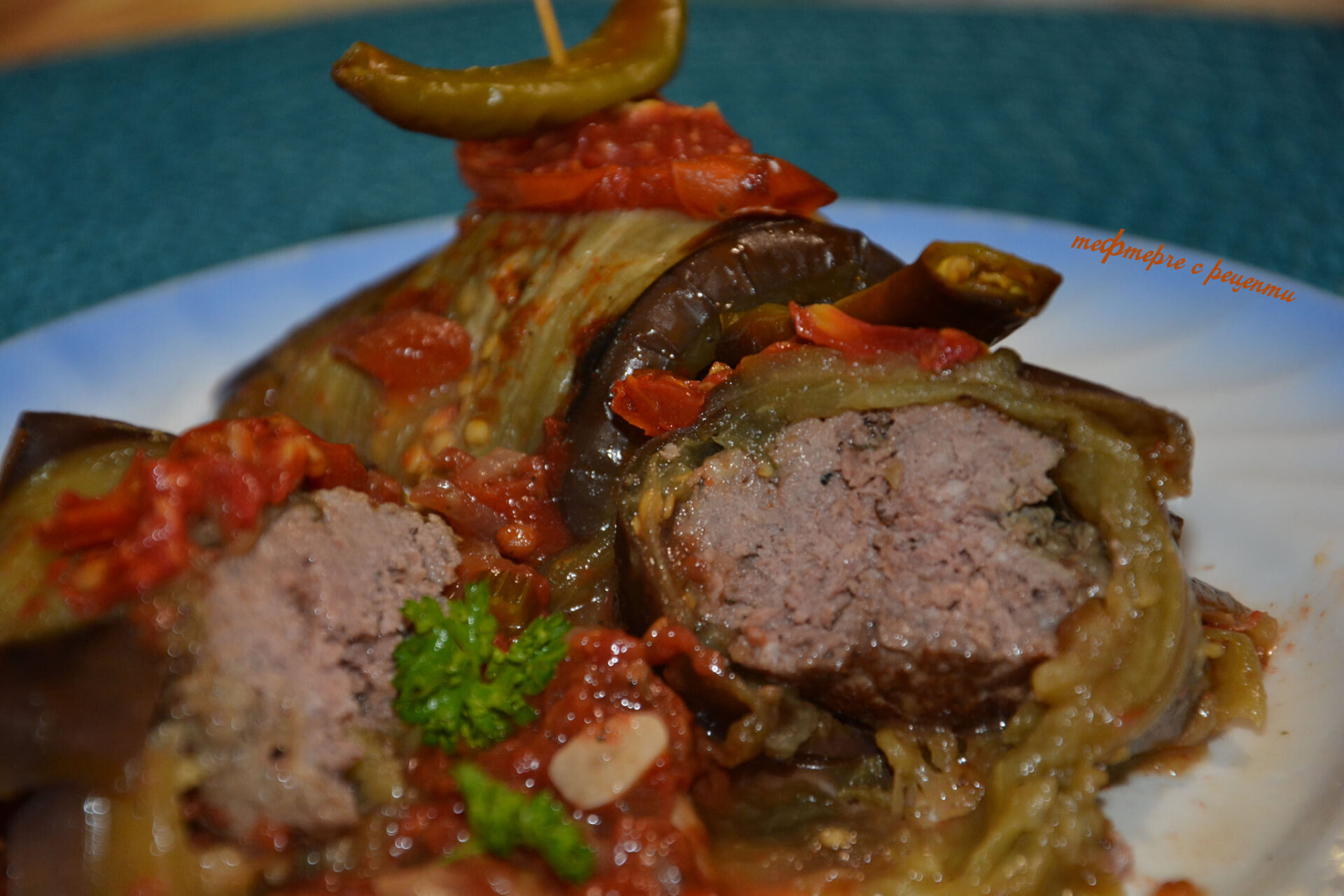 Από τον κιμά σχηματίζουμε κεφτεδάκια / 10 κομμάτια /, που ψήνουμε πολύ ελαφρά στο ίδιο ταψί. Τυλίξτε κάθε κεφτεδάκι στις λωρίδες μελιτζάνας. Υπάρχουν δύο τρόποι για να γίνει αυτό: είτε βάζουμε δύο μελιτζάνες σταυρωτά, ένα κεφτεδάκι στη μέση και σχηματίζουμε ένα δέμα, είτε βάζουμε ένα κεφτεδάκι σε μια μελιτζάνα και το τυλίγουμε σαν ρολό.