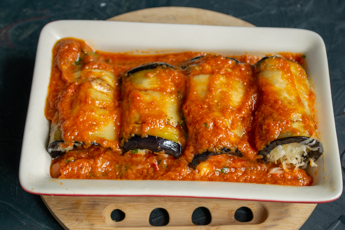 Διπλώστε και τυλίξτε κάθε φέτα, τακτοποιήστε τις τυλιγμένες μελιτζάνες σε ένα λαδωμένο ταψί και καλύψτε τις τυλιγμένες μελιτζάνες με τη σάλτσα ντομάτας που ετοιμάσατε νωρίτερα.