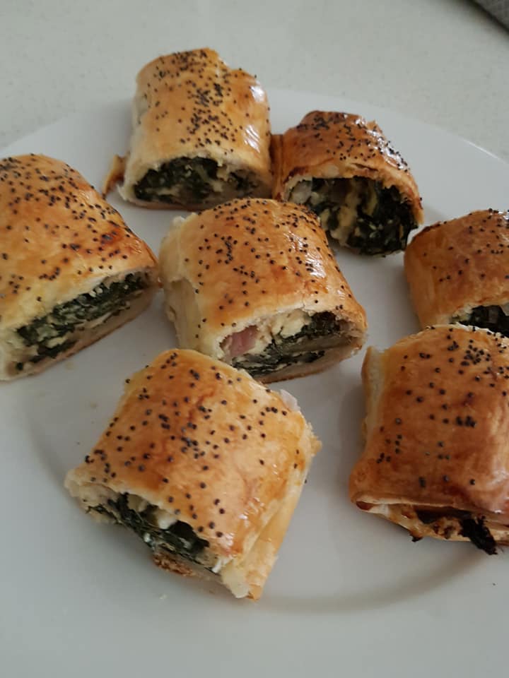 Απλώστε με το κουτάλι 1/2 φλιτζάνι του μείγματος κατά μήκος μιας άκρης του φύλλου σφολιάτας και τυλίξτε το σε ρολό. Επαναλάβετε με τα υπόλοιπα φύλλα σφολιάτας και μείγματος.